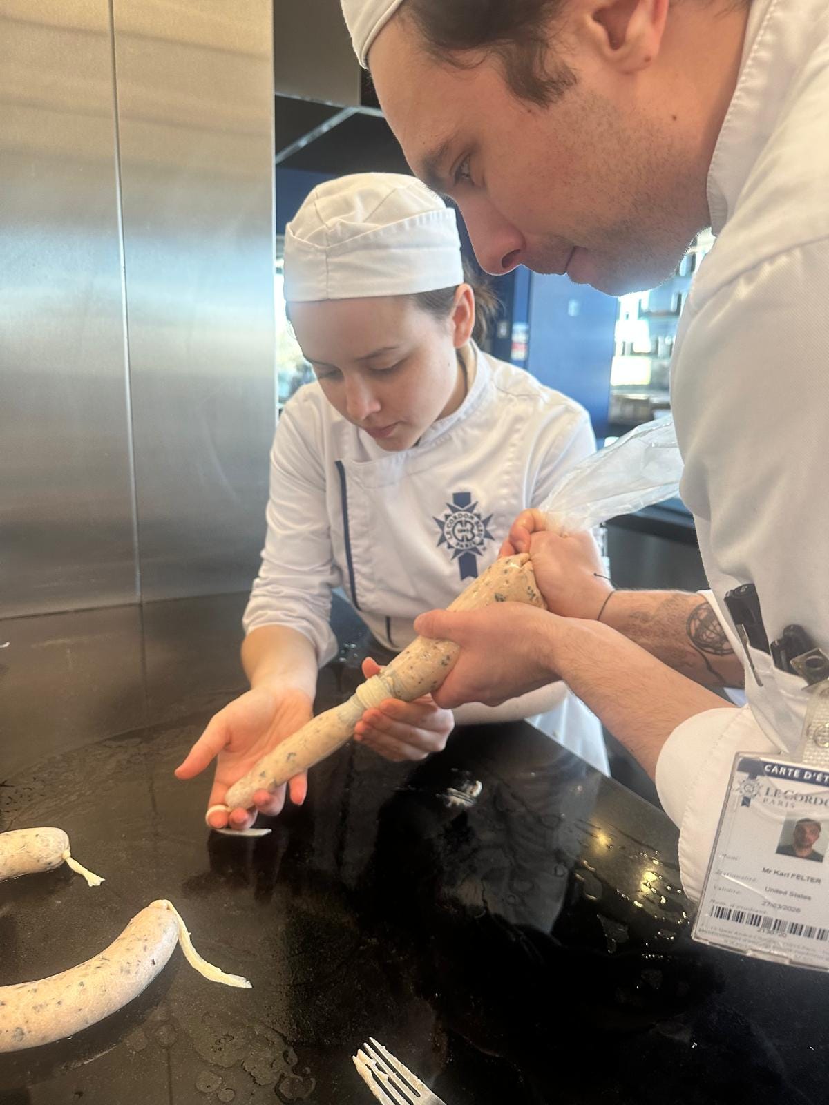 My second-to-last practical ever at Le Cordon Bleu involved making sausages the old-fashioned way. A drum sieve, a piping bag, and a dream created some of the best boudin I’ve ever tasted. While I’m feeling abundantly eager to close this chapter, I caught myself getting emotional while guiding a sausage casing as Karl piped in the filling and Meghan filmed the hilarity.